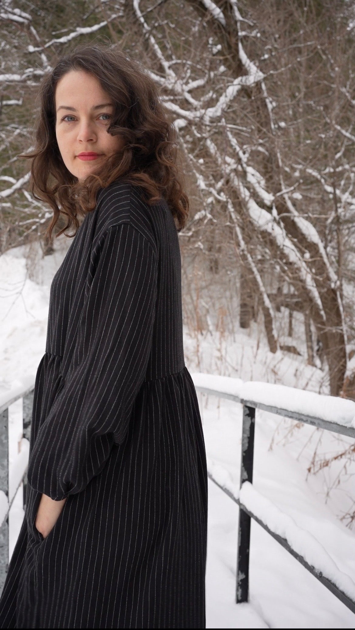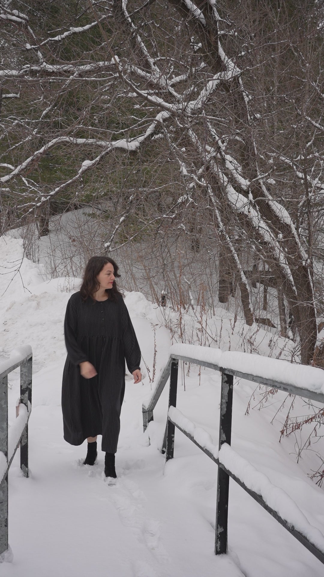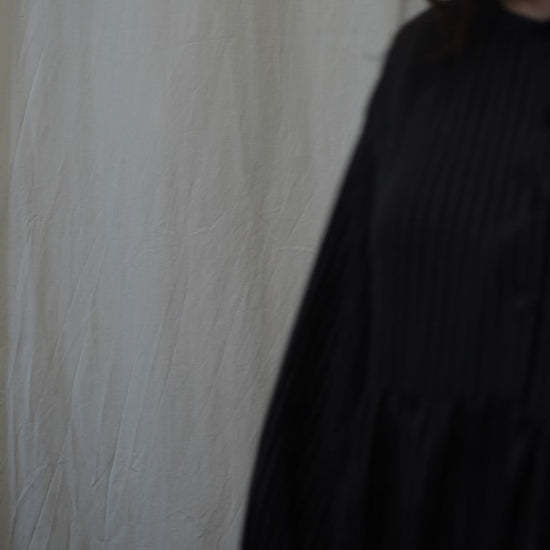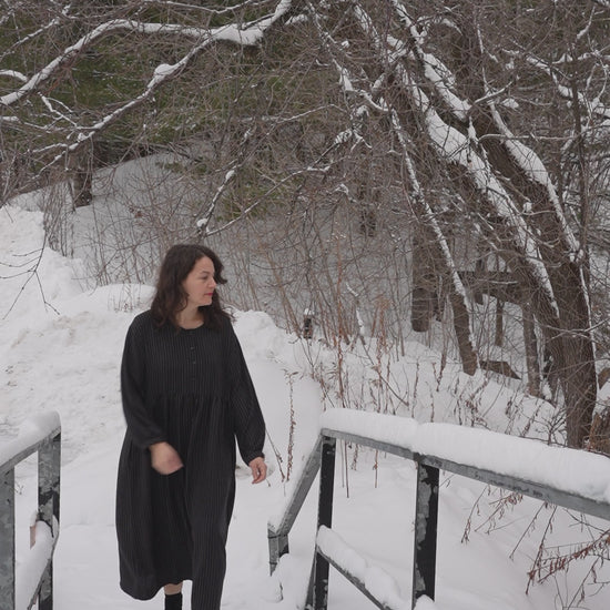 Here's a variation of my classic loose fit dress in a new black and white pinstripe fabric. This version of the dress has buttons up the front and sleeves that are gathered at the wrists. The fabric has a lovely flowy drape and is a medium weight. Pockets in the side seams of skirt (always!)